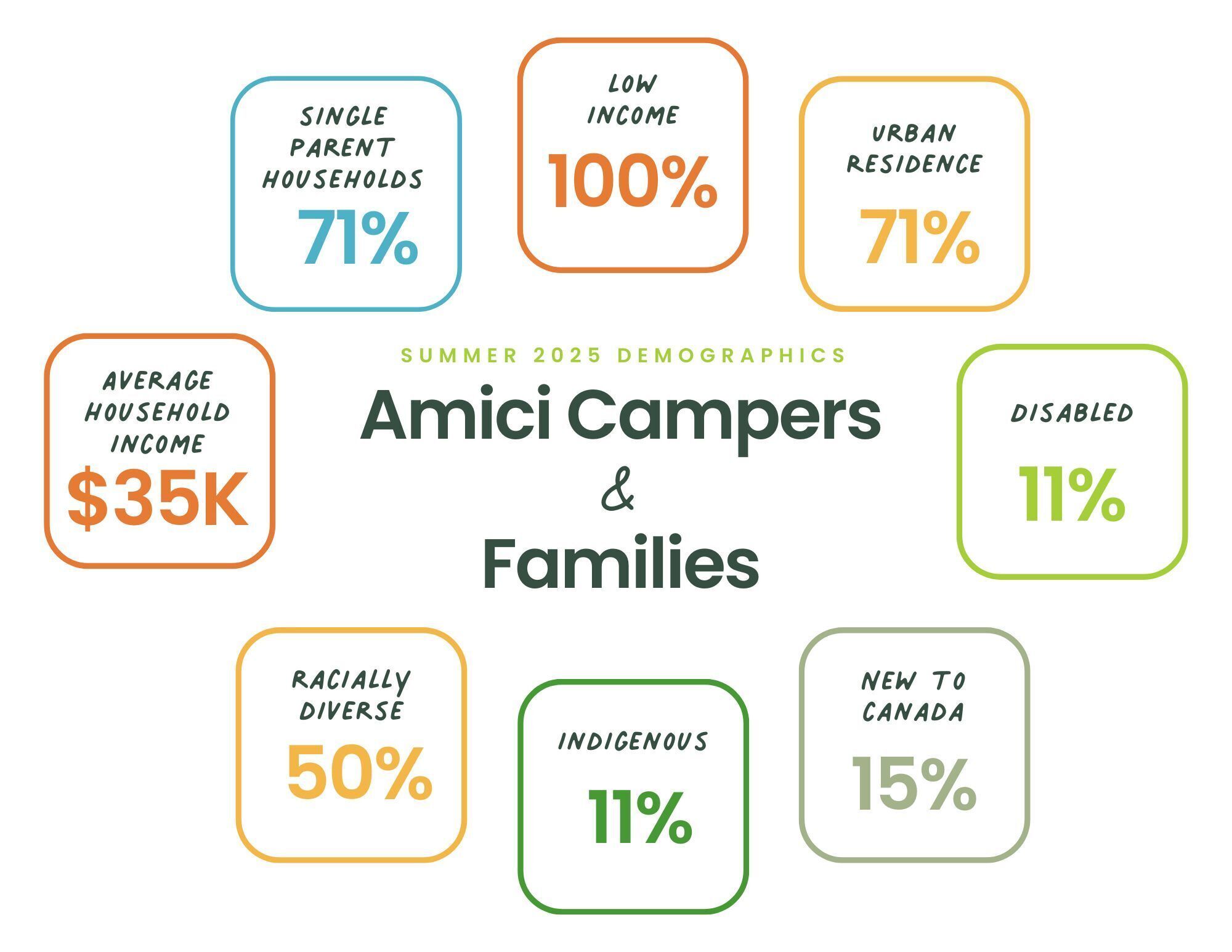 Amici recognizes that we are in a position to work with our partner camps to increase representational diversity and create inclusive camping experiences for children from equity-deserving groups. We will strengthen the confidence and trust that new and existing camper families have in the quality and benefits of the camp experience. We will prioritize equitable access to our services, ensuring that our campers represent the wide diversity in Ontario. Implementing this strategy remains our priority as we work to dismantle the barriers to overnight camp that are experienced by equity-deserving groups in Ontario.