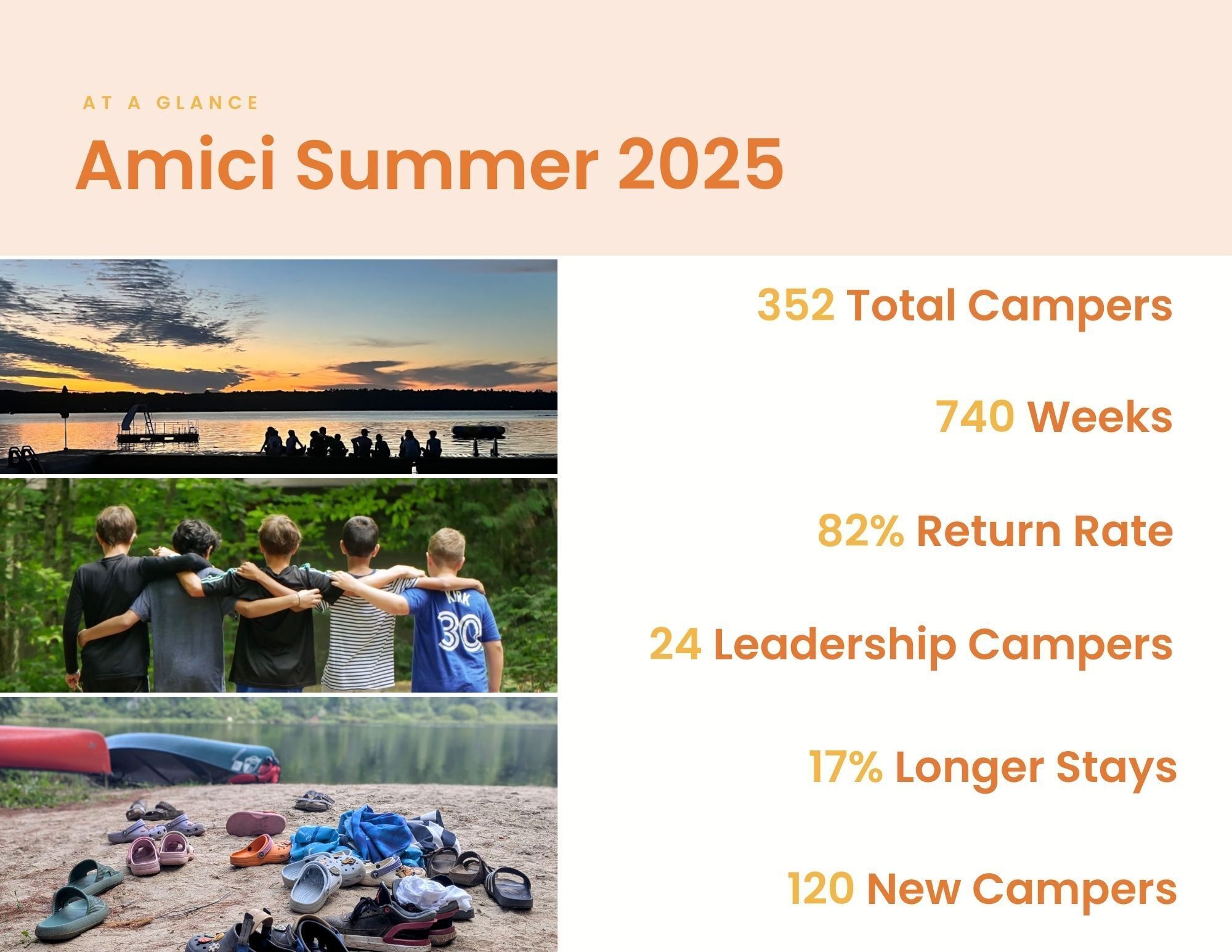 None of this would have been possible without Amici’s dedicated community. Your generosity opened doors for 352 children from low-income families to experience 740 weeks of adventure and development at 48 OCA-accredited overnight summer camps.