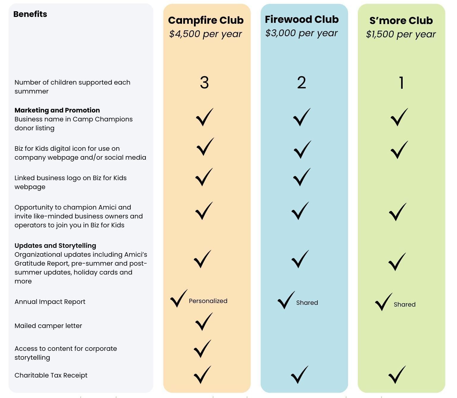 A three-year Biz for Kids pledge reflects the multi-year journey Amici campers enjoy at summer camp. It helps us count on businesses like yours, the way Amici campers count on us.